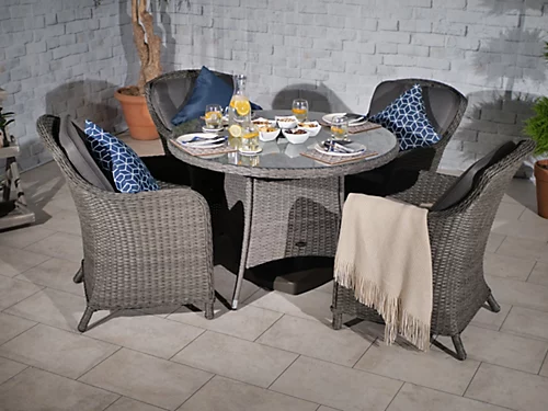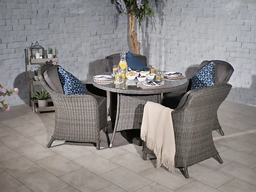 The Paris 4 seater dining set comes complete with 4 imperial dining chairs, with weather shield seat and back cushions and a floating, tempered glass top table with built in parasol hole. It is the perfect setting for outdoor lunch or dining or to simply relax with a drink. Made from the highest quality polyethylene double round wicker around a rigid aluminium frame its durable and weather resistant, making this set the ideal choice for dining with friends and family.