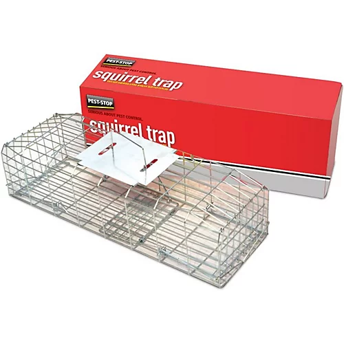 This Pest-Stop Squirrel Cage is a traditional device for the humane trapping of squirrels or similar sized pests, such as rats. It has doors at each end to entice squirrels to enter and take the bate. Squirrels are naturally cautious and do not like entering unfamiliar spaces from which they can not see an exit. When the intruder takes the bait, these doors close, safely trapping it inside.