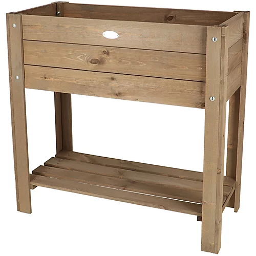 To reduce clutter, the wood planter has a convenient lower shelf for storing tools and seedlings.