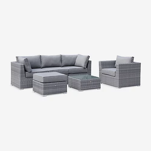 Designed to accommodate 5 people the Vinci sofa set can be easily placed on any terrace. Its particular design has reclined armrests that form V shaped seats. This gives it a trendy design side that appeals to people who love contemporary styles.The Vinci has 10 cm wide armrests and backrests and its seats are spacious. To offer premium comfort worthy of an indoor sofa the seat cushions are 14 cm thick those of the backrests 18 cm thick and the fabric is much better than the classic polyester. t is made from dense 270g/m² polyester.The Vinci is made of a double rounded braided polyrattan. This guarantees high quality as it is a stronger material than traditional plastic resin. It has a similar appearance to natural rattan. Polyrattan is a stylish and resistant material that does not require much maintenance. It can withstand the sun’s rays and bad weather (snow rain salt water). Unlike steel aluminium does not rust by nature and is much lighter. The cushion covers on the other hand are removable and resistant to sun and water. The glass top of the coffee tables is made of 5 mm thick tempered glass.Dimensions:2 x corner chairs: L80 x D80 x H67.5cm / 10.9kg1 x middle armchair: L65 x D80 x H67.5cm / 7.7kg1 x individual armchair: L95 x D80 x H67.5cm / 11.8kg1 x coffee table: L65 x D65 x H31cm / 7.6kg1 x footrest: L65 x D65 x H44cm / 5.1kgSeat height: 44cm (30cm without cushion)Frame material: AluminiumMaterial: Premium rounded polyrattan6 Connectors included