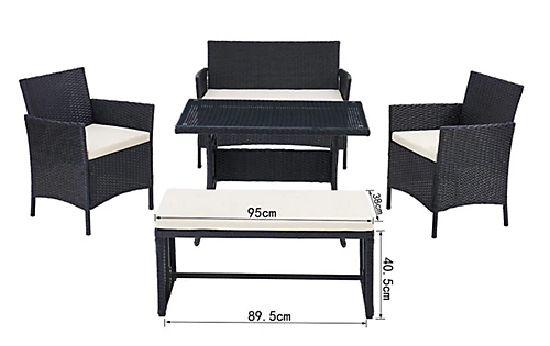 Introducing Rosa five piece garden furniture set. It is available in black. It’s is completed with a matching rattan glass dining table and foam filled polyester cushions. The cushion covers are removable and come with zips. This set would make the perfect addition to your home and your garden. It is perfect for sitting comfortably on a nice day or night. (only the 5 piece option comes with the bench!)