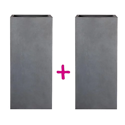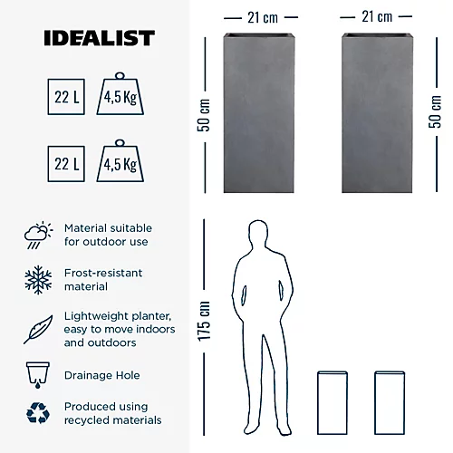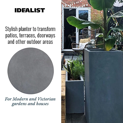 - UV & FROST RESISTANT tall square plant pot. This dark grey planter has a contemporary concrete look. Place it in the garden for stylish flower arrangements