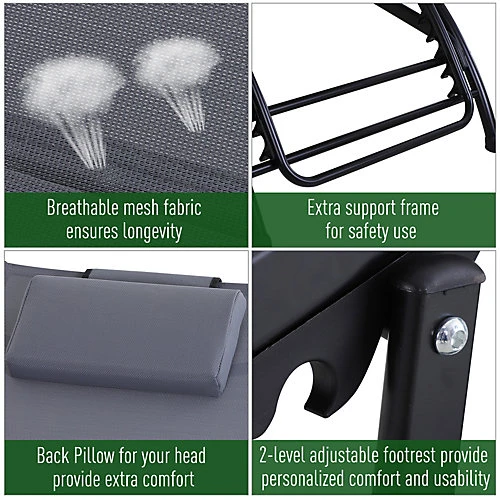 - • Item Name: KD leisure chair • Brand Name: Outsunny • Material: Aluminum Frame, Texteline Fabric • Color:Grey • Max Load: 120kg • Overall Dimension: 66W x 152D x 81H cm • Reclining Dimension: 66W x 173D x 40H cm • Seat Dimension: W58 x 52.5D cm • Seat Height(Front): 40cm • Seat Height(Rear): 30cm • Net Weight: 6.6kg• Flat Pack: Yes • Custom Label: 84B-447V70GY