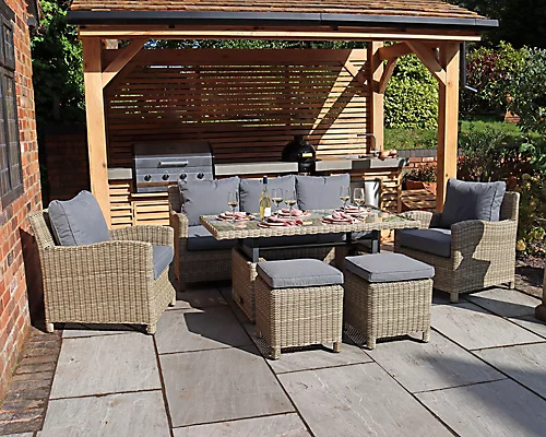 Relax in this stylish Wentworth 7 Seater Deluxe Sofa Dining Set, retaining classic style with an aluminium framework construction and legendary hand woven, synthetic, half round rattan weave. This set offers style, comfort, strength and durability, consisting of a rectangular adjustable table, a 3 seater sofa, 2 armchairs and 2 footstools. The Wentworth 7 Seater Deluxe Sofa Dining Set also features weather shield seat and back cushions which are stain resistant and water resistant. The table can be adjusted to suit your needs as a coffee or dining table, making this the ultimate, luxury, adjustable garden set.