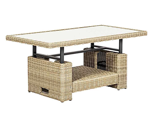- Adjustable table that can be raised for dining or lowered for use as a coffee table