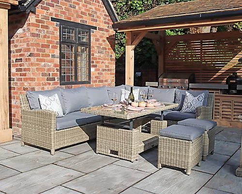 Relax in this Wentworth 8 Seater Deluxe Corner Dining Set, retaining classic style with an aluminium framework construction and legendary hand woven, synthetic, half round rattan weave. This set offers style, comfort, strength and durability, consisting of a rectangular adjustable table, a left hand two seater sofa, a right hand two seater sofa, a corner chair and a middle chair and 2 footstools. The Wentworth 8 Seater Deluxe Corner Dining Set also features weather shield seat and back cushions which are stain resistant and water resistant. The table can be adjusted to suit your needs as a coffee or dining table, making this the ultimate, luxury, adjustable garden set.